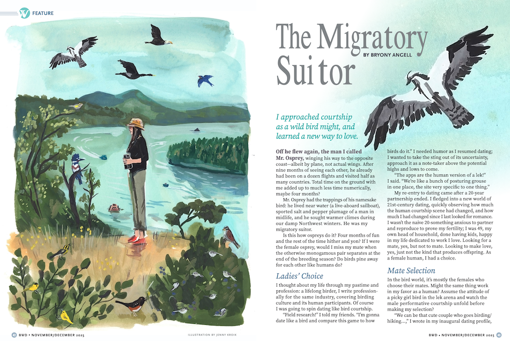 This marks our third podcast appearance talking about the comparisons between wild bird and human pair bonding behaviors—or what we call “dating like a bird.” Wenfei’s book Bird Love: The Family Life of Birds inspired my human version essay, “The Migratory Suitor: I approached courtship as a wild bird might, and learned a new way to love,” published in the November December 2025 BWD (formerly Bird Watcher’s Digest), and now available to read in full at the link above.